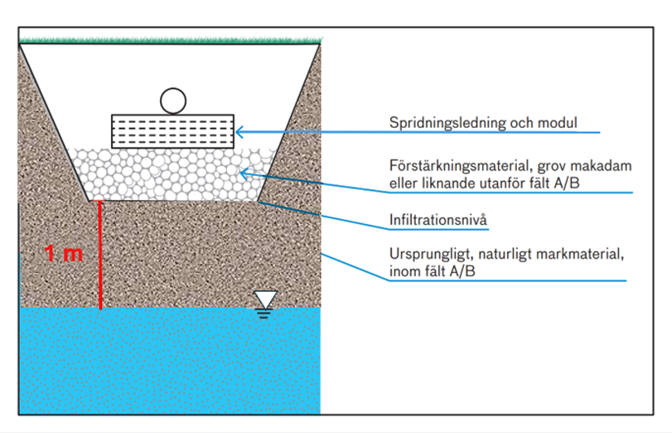Avståndet mellan infiltrationsnivån och grundvattenytan ska med undantag för kortare perioder (högst 2 månader under ett år) uppgå till minst 1 m. Avståndet mellan infiltrationsnivån och grundvattenytan får aldrig understiga 0,5 m.