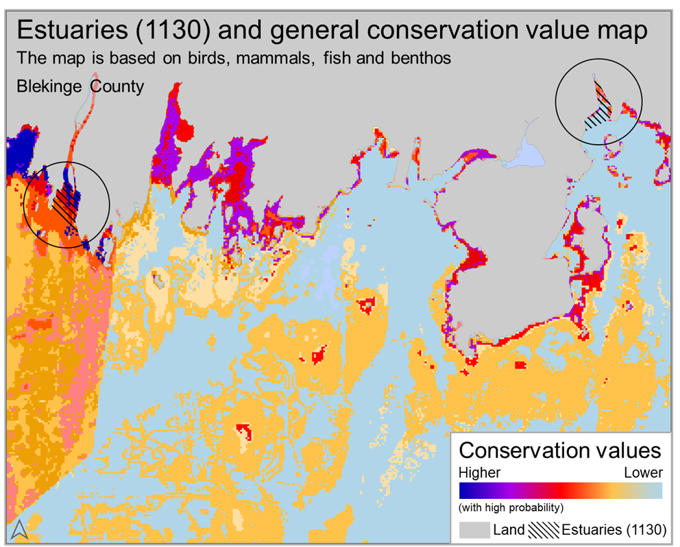 Figure 2. General conservation value map over an area of southern Sweden (Blekinge), including two estuaries (in circles, habitat type 1130). The map shows that the western estuary has a higher conservation value than eastern estuary according to the assessment framework developed in MOSAIC (click on the picture to enlarge).