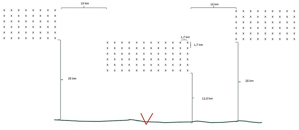 Parken är tjugo kilometer lång och tio kilometer bred med långsidan mot kusten och bilderna visar den på 5 km 12,5 km, 25 km, 35 km och 50 km från land.