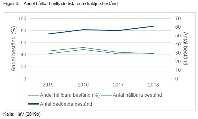 Fisk- och skaldjursbestånd i svenska vatten påverkas av olika faktorer. Det fiske som bedrivs måste ske hållbart för att säkerställa ett fiske även i framtiden. Ett hållbart fiske är en förutsättning för att kunna nå miljökvalitetsmålet Hav i balans samt levande kust och skärgård. Att bara 42 procent av fiskbestånden nyttjades på ett hållbart sätt 2018 betyder att vi inte är nära att nå målet. Trots att fler bestånd bedömts under senare år har antalet hållbart nyttjade bestånd minskat i antal.11