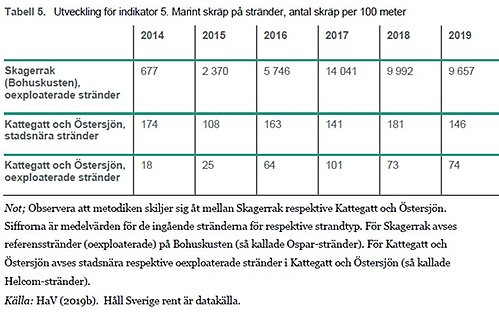 Mängden strandskräp (antal skräp per 100 meter strand) varierar mycket från år till år på vissa stränder, medan förekomsten på andra stränder har mindre variation mellan provtagningarna. Medelvärdet för antal skräpföremål per 100 meter strandsträcka för perioden 2012-2017 pekar på en kraftig ökning av antalet skräpföremål på stränderna längs Bohuskusten (Skagerrak) och på de oexploaterade stränderna i Kattegatt och Östersjön.